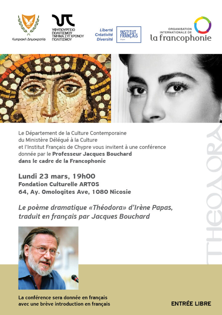 Αφιερωμένη στο λιγότερο γνωστό, αλλά ιδιαίτερα ενδιαφέρον συγγραφικό έργο της Ειρήνης Παπά, η διέλεξη έχει θέμα «Το δραματικό ποίημα “Θεοδώρα” της Ειρήνης Παπά» και εντάσσεται στο πλαίσιο των εκδηλώσεων για τη Γαλλοφωνία. Διοργανώνεται από το Τμήμα Σύγχρονου Πολιτισμού σε συνεργασία με το Γαλλικό Ινστιτούτο Κύπρου.
