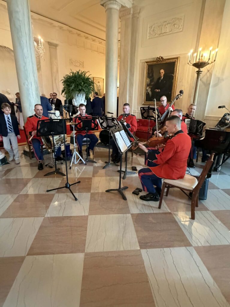 Η δεξίωση ξεκίνησε με χορούς και ελληνικά τραγούδια, που εκτελούνταν από τη μπάντα του αμερικανικού στρατού, δημιουργώντας ζωντανή και γιορτινή ατμόσφαιρα.