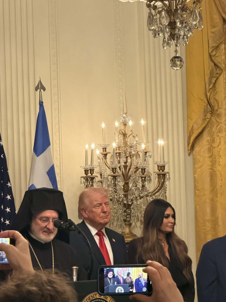 Ο Αρχιεπίσκοπος Αμερικής Ελπιδοφόρος σε σύντομο χαιρετισμό ευχαρίστησε τον Τραμπ για τις επαφές του με τον Ρετζέπ Ταγίπ Ερντογάν σχετικά με το άνοιγμα της Θεολογικής Σχολής της Χάλκης, εκφράζοντας εκτίμηση για την προώθηση της ειρήνης και της συνεργασίας.
