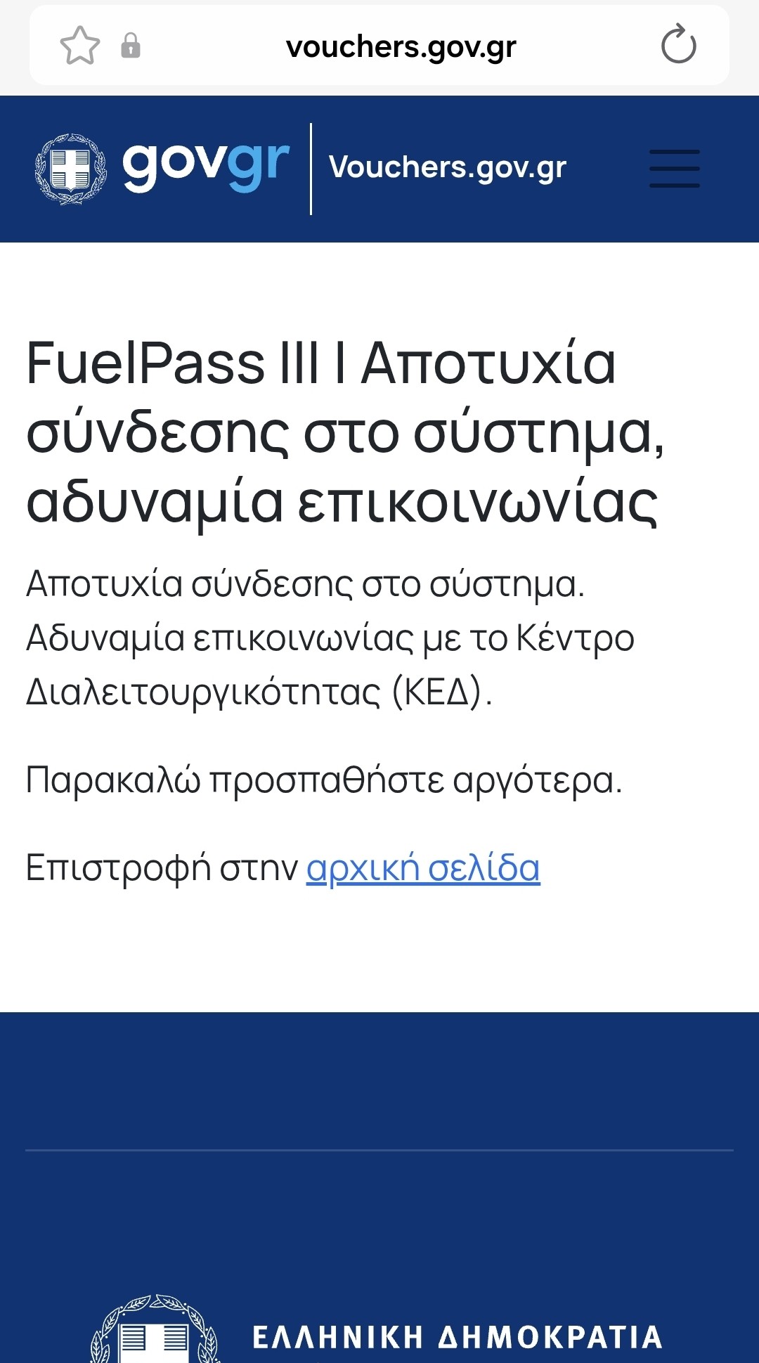 Σοβαρά τεχνικά προβλήματα αντιμετωπίζει, από τα πρώτα λεπτά μετά την επίσημη εκκίνησή της στις 4:30 το απόγευμα της Μεγάλης Δευτέρας, η πλατφόρμα υποδοχής αιτήσεων για τη χορήγηση επιδότησης αγοράς καυσίμων Fuel Pass ΙΙΙ.