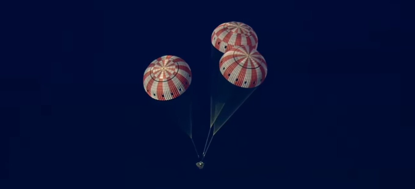 Όταν έφτασε στο κατάλληλο ύψος, άνοιξαν τα αλεξίπτωτα που επιβράδυναν την πτώση και οδήγησαν την κάψουλα σε ομαλή προσθαλάσσωση, στις 03:07 του Σαββάτου (ώρα Ελλάδος) χωρίς κανένα απολύτως πρόβλημα. Ο καιρός στον Ειρηνικό, στο σημείο της προσθαλάσσωσης ήταν καλός.