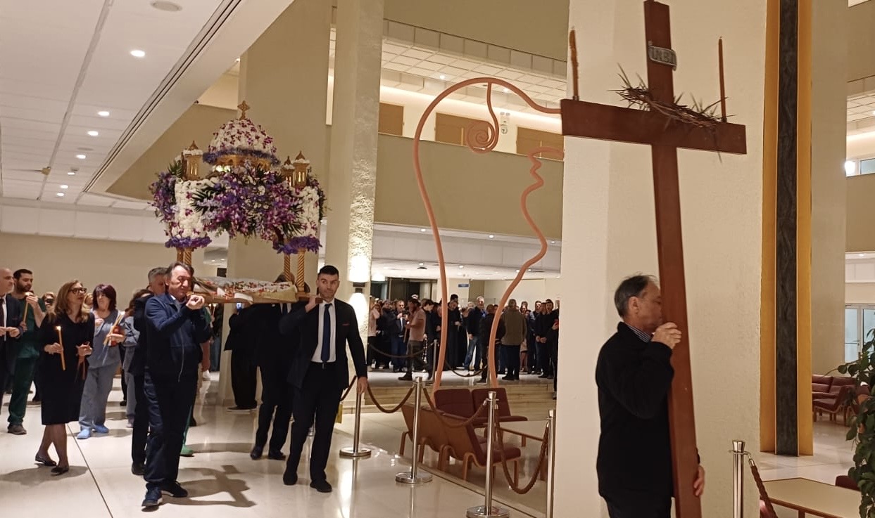 Σε μια από τις πιο συγκινητικές στιγμές της Μεγάλης Παρασκευής εκτυλίχθηκε το βράδυ η λιτανεία του Επιταφίου στο Ωνάσειο Νοσοκομείο, μεταφέροντας το μήνυμα της πίστης και της ελπίδας σε ασθενείς, συγγενείς και εργαζόμενους που περνούν αυτές τις άγιες ημέρες μέσα στο νοσοκομείο.