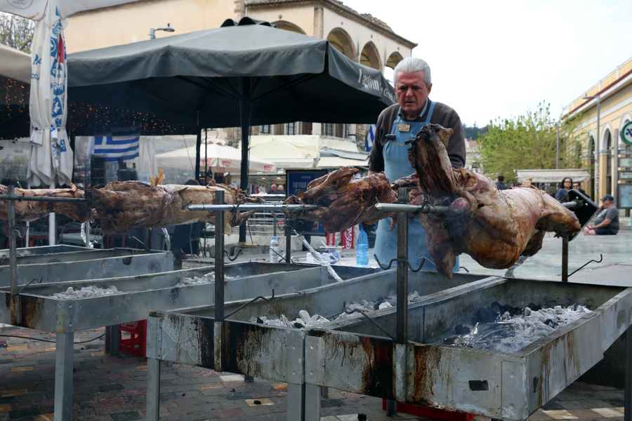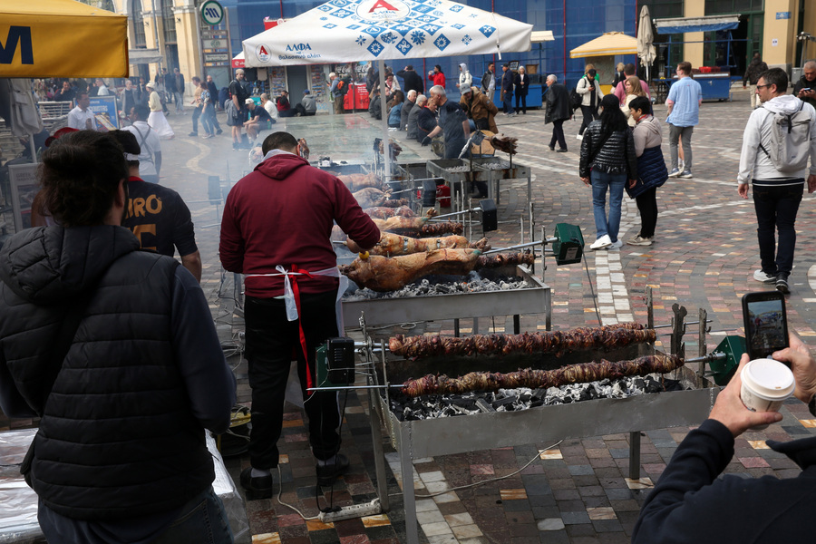 Όπως κάθε χρόνο, έτσι και φέτος, η πλατεία στο Μοναστηράκι της Αθήνας «χορεύει» σε ρυθμούς Πάσχα μιας και τα μαγαζιά ξεκίνησαν να ψήνουν για να εξυπηρετήσουν το κοινό τους.