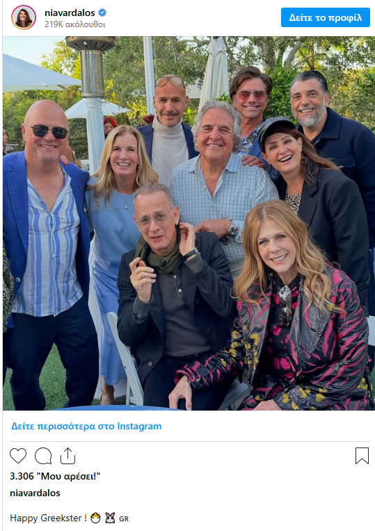Η Νία Βαρντάλος μοιράστηκε μία ανάρτηση στο Instagram, μια μέρα μετά το ελληνικό Πάσχα, στην οποία απεικονίζονται και οι John Στάμος και Σπύρος Κατσαγιάννης. Όλοι τους χαλαροί και ευδιάθετοι μπροστά από τον φωτογραφικό φακό, με την παρουσία του Τομ Χανκς να κεντρίζει τα βλέμματα.