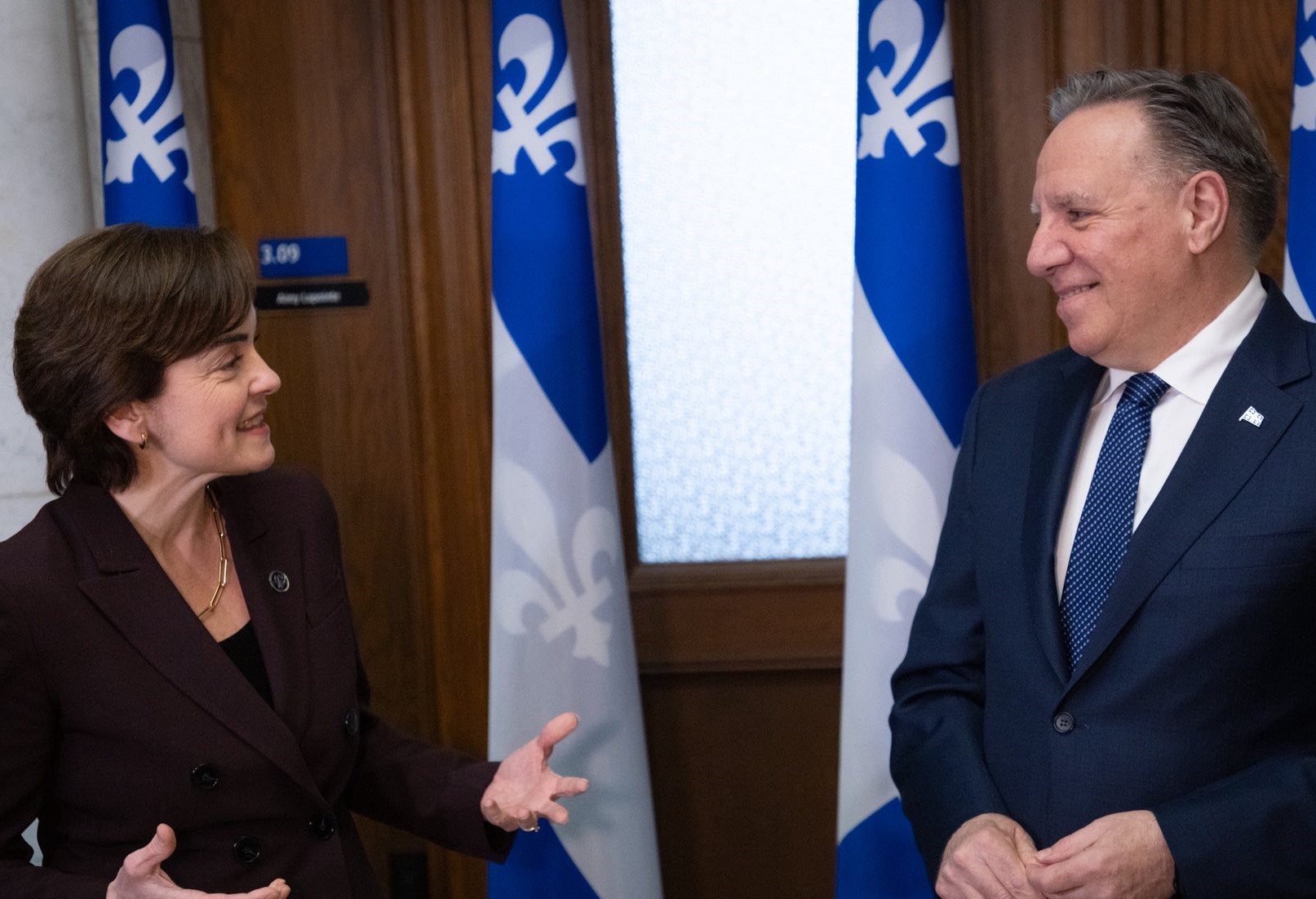 Την Τρίτη, ο ο απερχόμενες Πρωθυπουργός του Κεμπέκ Φρανσουά Λεγκώ (Legault) υποδέχτηκε τη διάδοχό του, Κριστίν Φρεσέτ (Fréchette), στο κτίριο Honoré-Mercier στο Κεμπέκ για την παράδοση της εξουσίας.