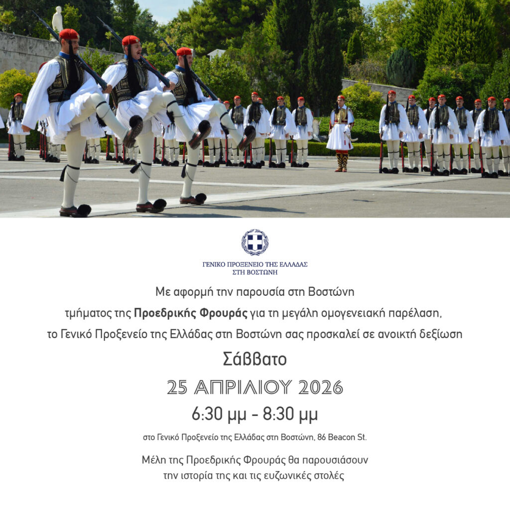 Το Γενικό Προξενείο της Ελλάδας στη Βοστώνη, το Σάββατο 25 Απριλίου, στις 6.30 το απόγευμα, οργανώνει ανοικτή δεξίωση με αφορμή την παρουσία στη Βοστώνη Τμήματος της Προεδρικής Φρουράς για την μεγάλη ομογενειακή παρέλαση.