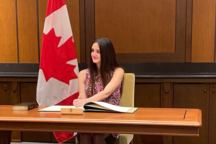 Η ομογενής βουλευτής Εμμανουέλα Λαμπροπούλου μιλά στην Καναδική Βουλή για την 25η Μαρτίου κρατώντας στην αγκαλιά τη νεογέννητη κόρη της.